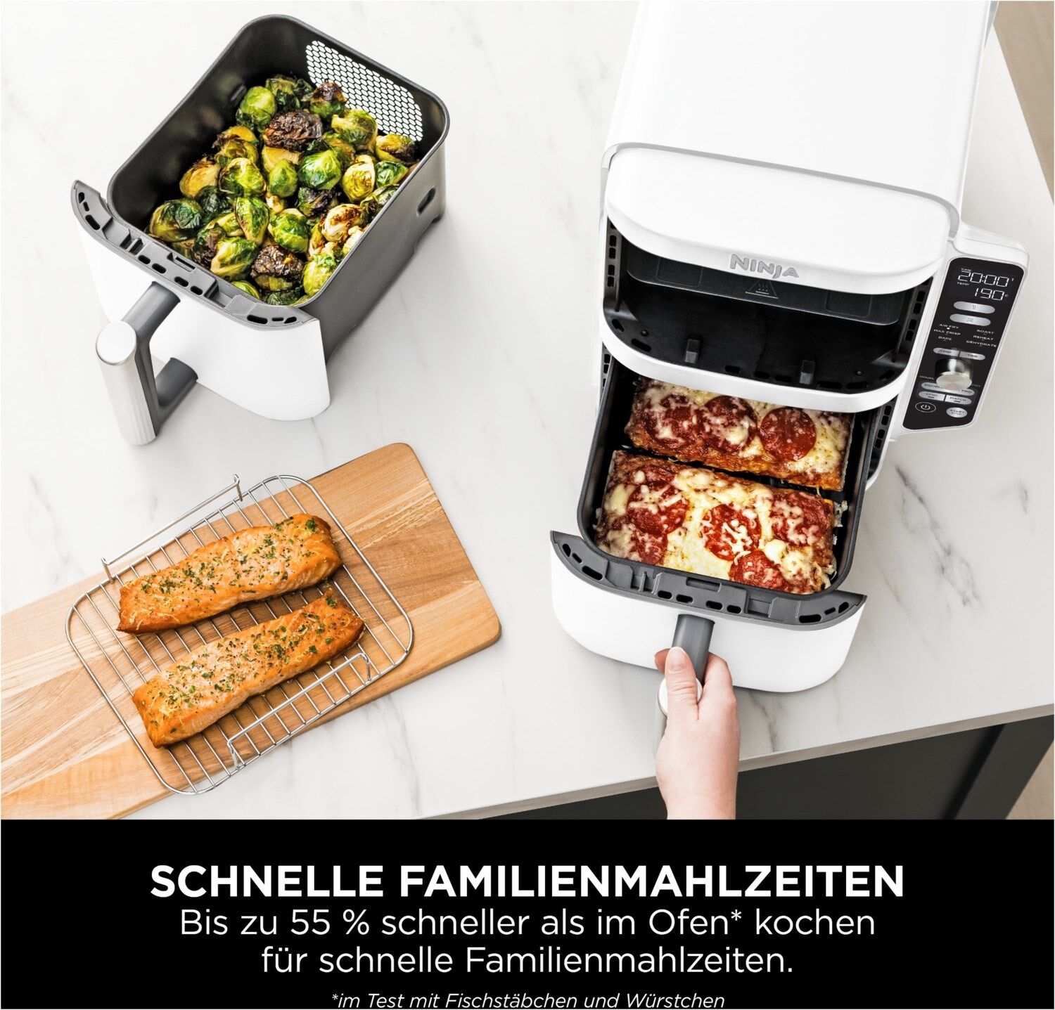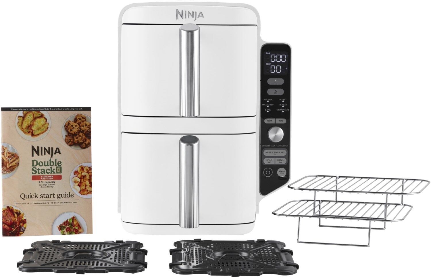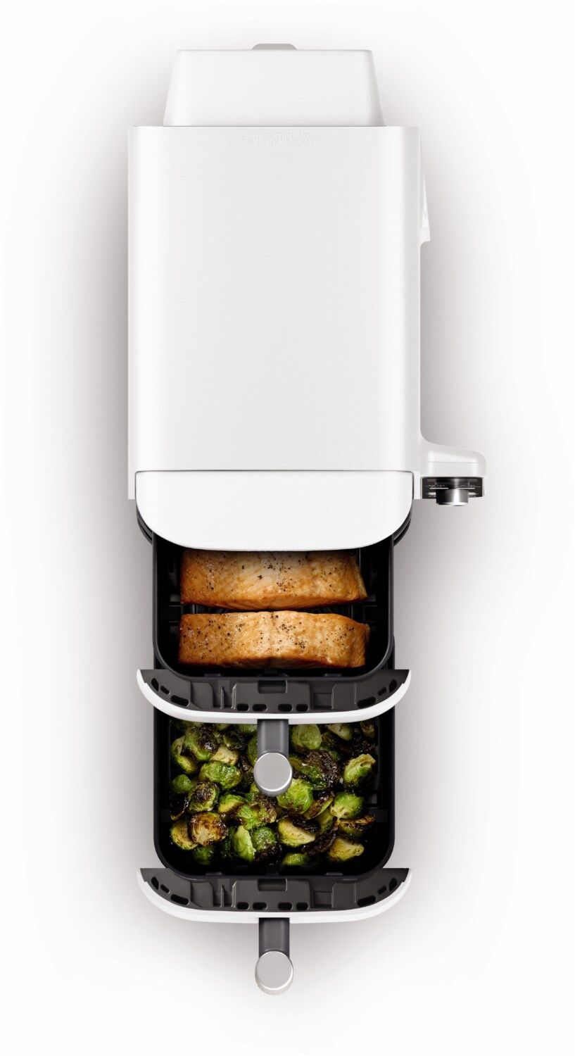 - Lieferumfang: 1 x Haupgerät, 2 x 4,75 L Heißluft-Frittierfächer mit Antihaftbeschichtung, 2 x Crisper Gittereinsatz mit Antihaftbeschichtung, 2 x Multi-Layer Rost 1 x Kurzanleitung, 1 x Bedienungsanleitung