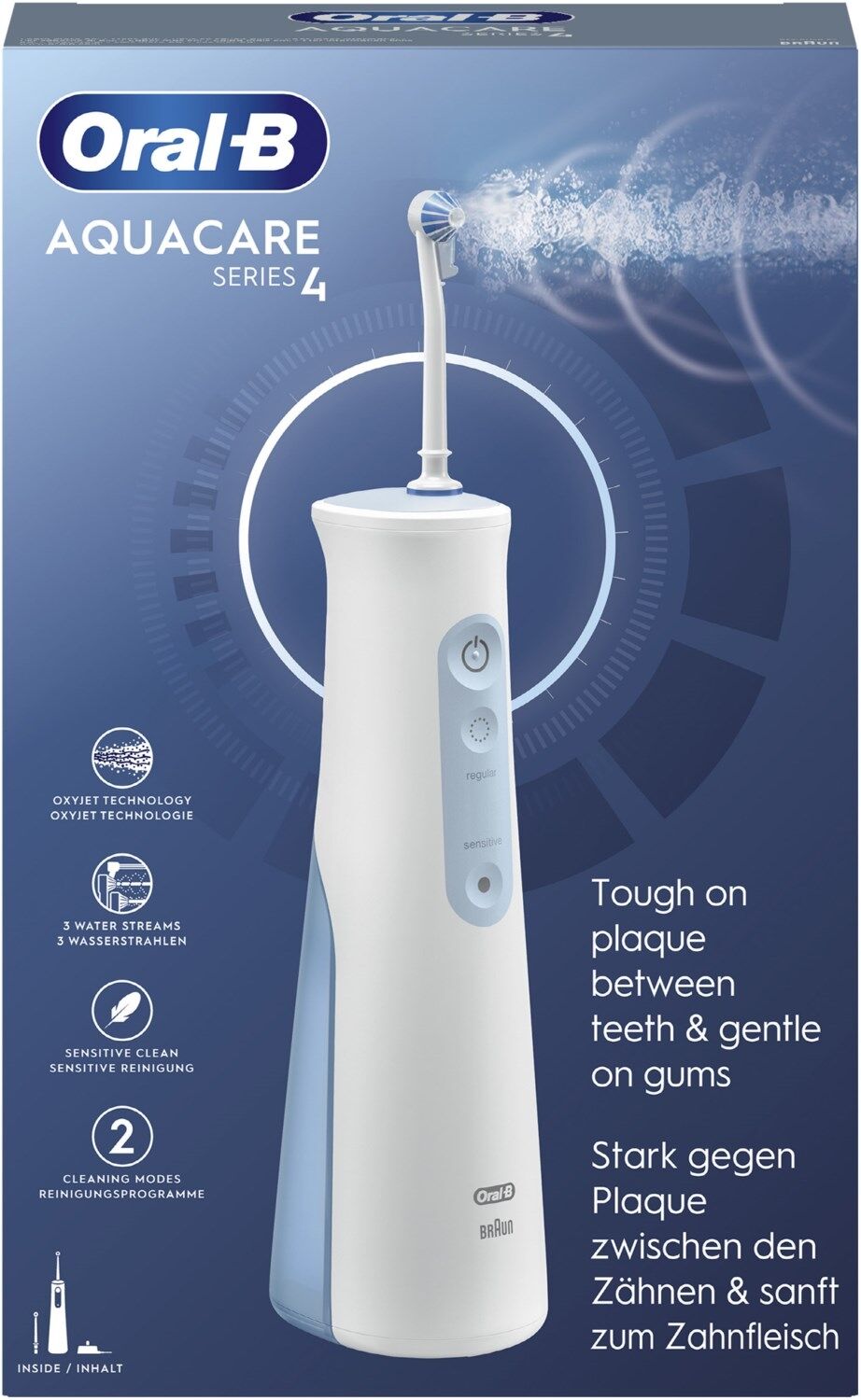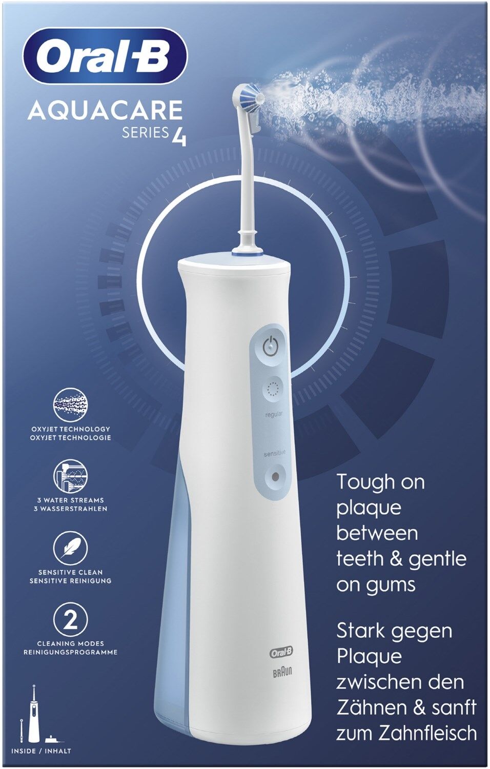 - Lieferumfang: 1 AquaCare 4 Munddusche, 1 Ladestation, 1 Oxyjet Aufsteckdüse, 1 Waterjet Aufsteckdüse