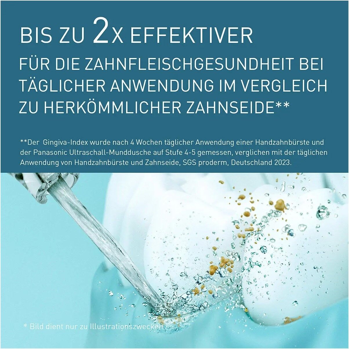 ² Gingiva-Index gemessen nach 4 Wochen täglicher Anwendung der Handzahnbürste und der Ultraschall-Munddusche von Panasonic auf Stufe 4–5 im Vergleich zur täglichen Anwendung von Handzahnbürste und Zahnseide, SGS proderm, Deutschland 2023.