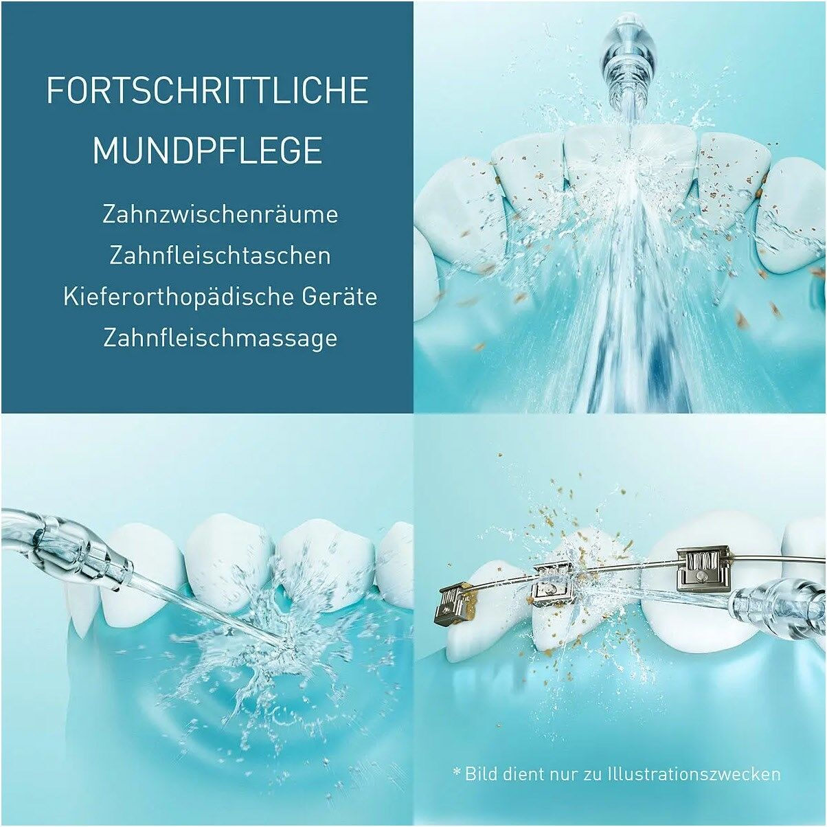 Selbst wenn Sie glauben, Ihre Zähne gründlich geputzt zu haben, bleiben beim Putzen mit einer herkömmlichen Zahnbürste etwa 40 % der Speisereste zurück. Durch das Verwenden einer Munddusche können Speisereste und Zahnbelag einfach und effektiv entfernt werden, auch in den Zahnzwischenräumen, die mit der Zahnbürste nur schwer zu erreichen sind.