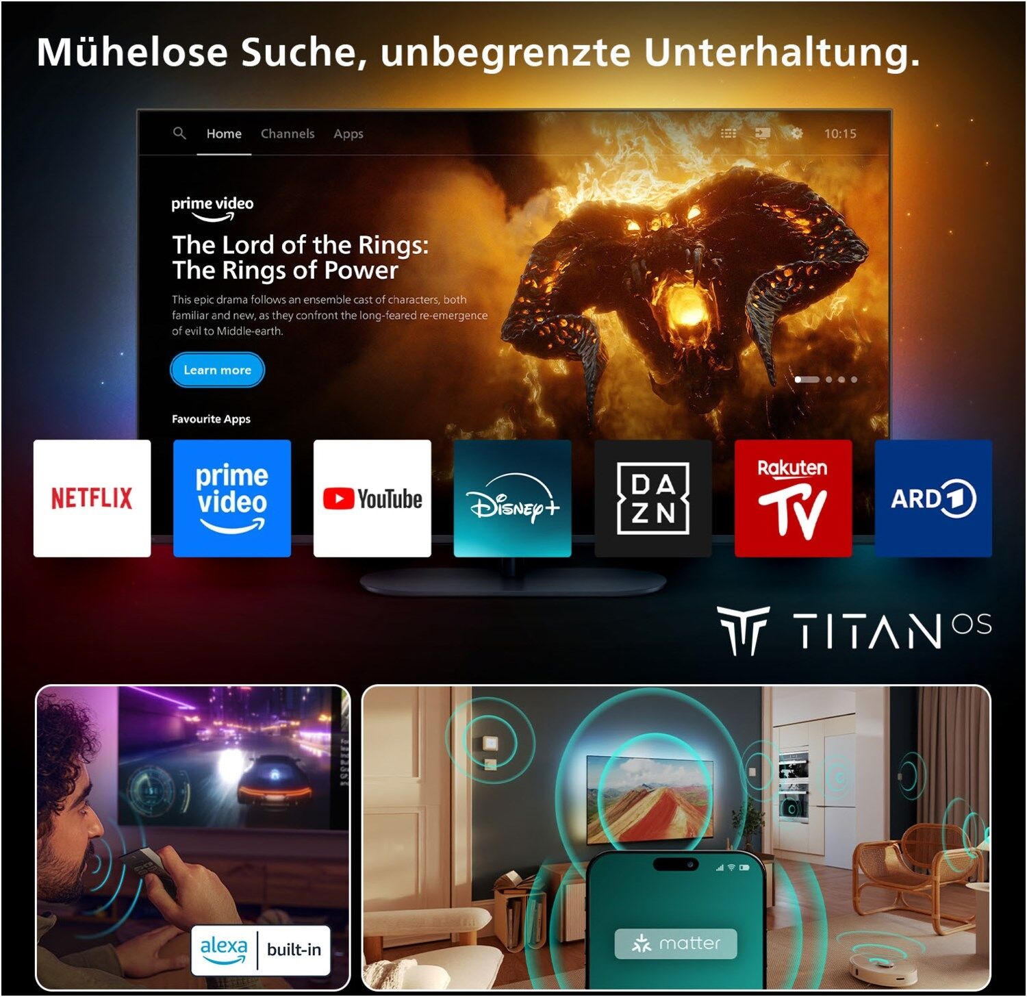 Die Philips Smart TV Titan OS-Plattform führt Sie ganz schnell zu den Inhalten, die Sie sich gerne ansehen. Von einzelnen Folgen über Serien bis hin zu Dokumentationen und Dramen – alles, was das Herz begehrt, ist auf Knopfdruck verfügbar. Egal, was Sie sich ansehen möchten, greifen Sie schnell und einfach auf all Ihre Streaming-Apps zu.