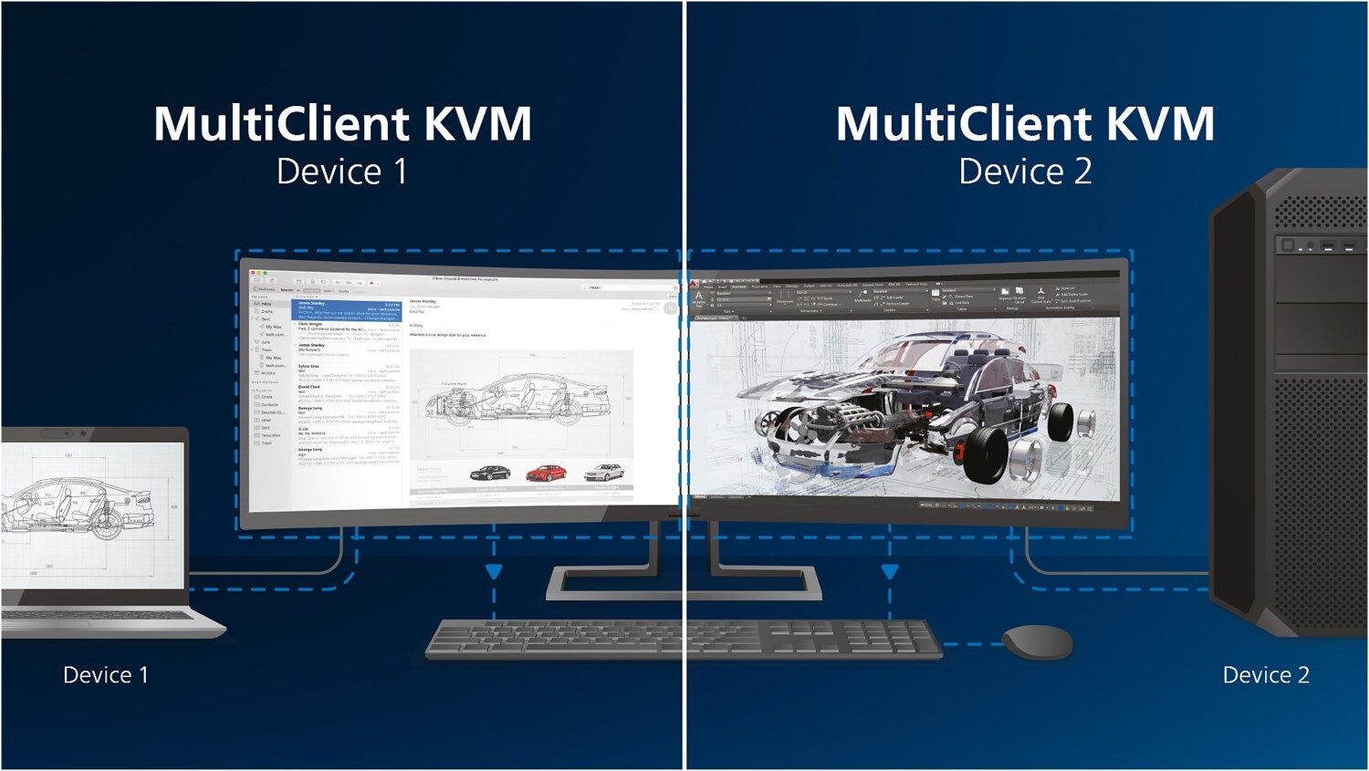 Mit dem integrierten Multiclient-KVM-Switch können Sie zwei separate PCs mit einem Monitor-Tastatur-Maus-Setup bedienen. Eine praktische Taste ermöglicht den schnellen Wechsel zwischen den Signalquellen. Besonders praktisch bei Setups, die doppelte PC-Rechenleistung erfordern, oder zur gemeinsamen Nutzung eines großen Monitors für die Anzeige von zwei verschiedenen PCs.