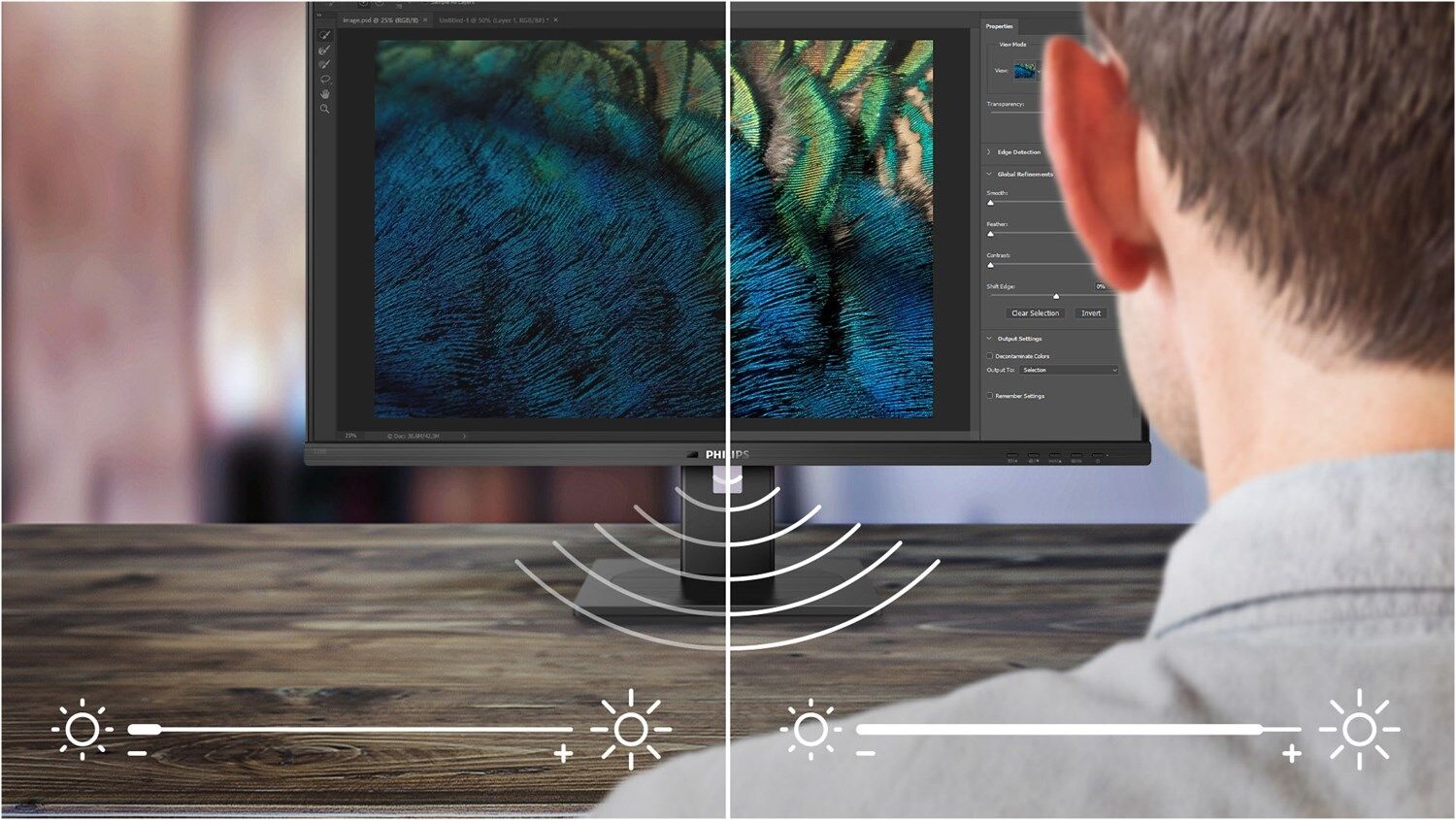 PowerSensor ist ein integrierter Sensor, der durch das Aussenden und Empfangen unbedenklicher Infrarotsignale erkennt, ob sich der Benutzer in der Nähe des Geräts aufhält, und automatisch die Bildschirmhelligkeit reduziert, wenn der Benutzer sich vom Schreibtisch entfernt. So wird der Energieverbrauch um bis zu 80 % gesenkt und die Monitorlebensdauer verlängert.