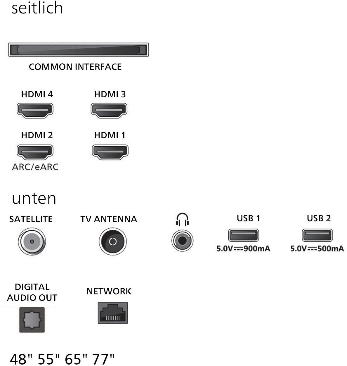 - DVB-T2/-C/-S2 Triple Tuner, 4x HDMI (eARC auf HDMI 2), HDMI 2.1, 2x USB, CI+, Digitaler Audio-Ausgang (optisch), LAN, WLAN 802.11ac (2x2 Dualband) & Bluetooth 5.2 integriert