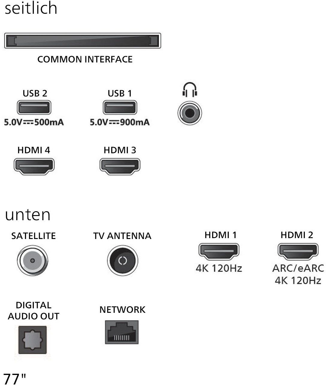 - DVB-T2/-C/-S2 Triple Tuner, 4x HDMI (eARC auf HDMI 2), HDMI 2.1, 2x USB, CI+, Digitaler Audio-Ausgang (optisch), LAN, WLAN 802.11ax (2x2 Dualband) & Bluetooth 5.2 integriert