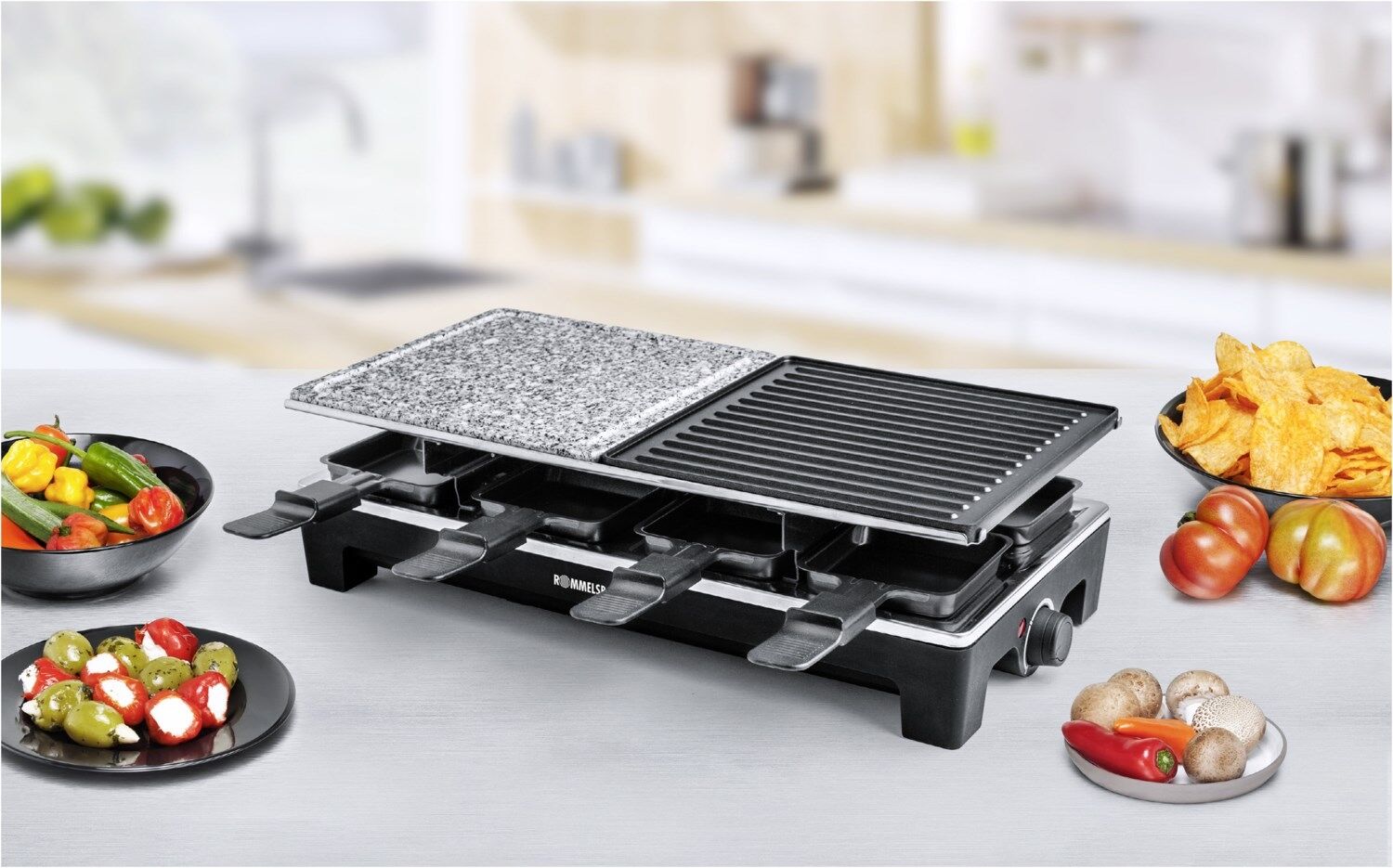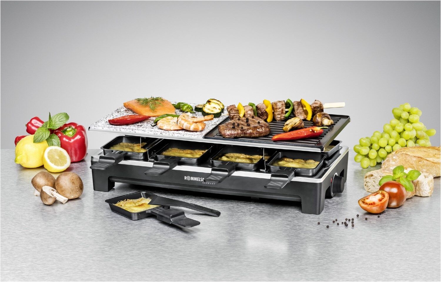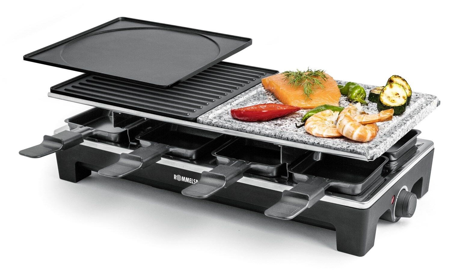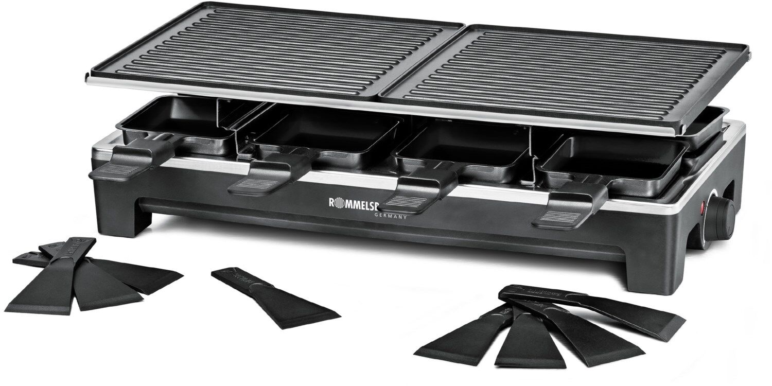 Dieses hochwertige Raclette aus dem Hause ROMMELSBACHER sorgt künftig noch mehr kulinarische Vielfalt beim Raclette-Grillen. Die verschiedenen Wechselplatten lassen sich frei kombinieren, so ist man flexibel in Auswahl und Kombination der Grilloberflächen. Ob auf den beiden hochwertig beschichteten Wendeplatten (eine Seite geriffelt, die andere glatt) oder auf dem Naturstein – für jeden Geschmack ist das Richtige dabei.