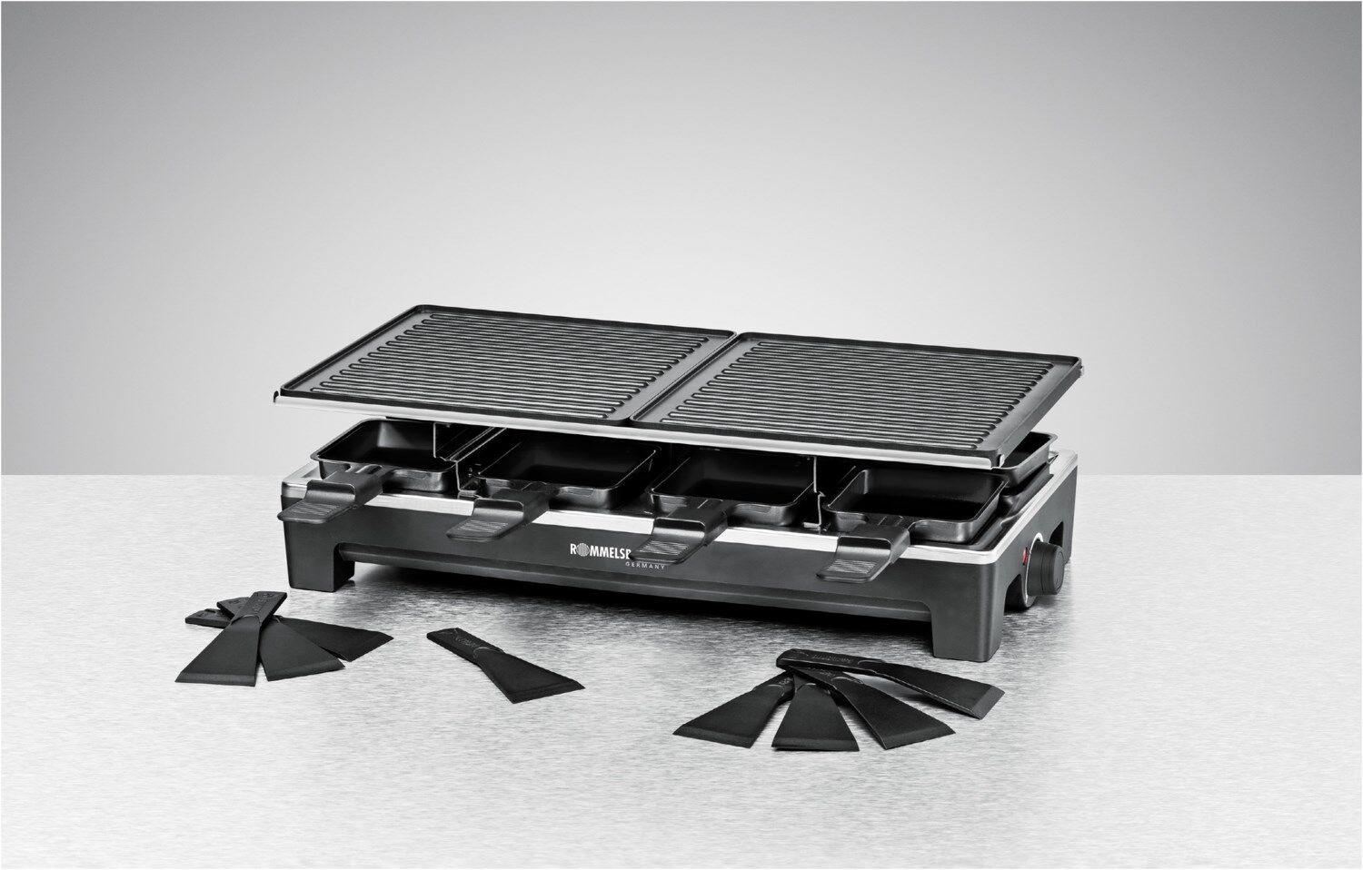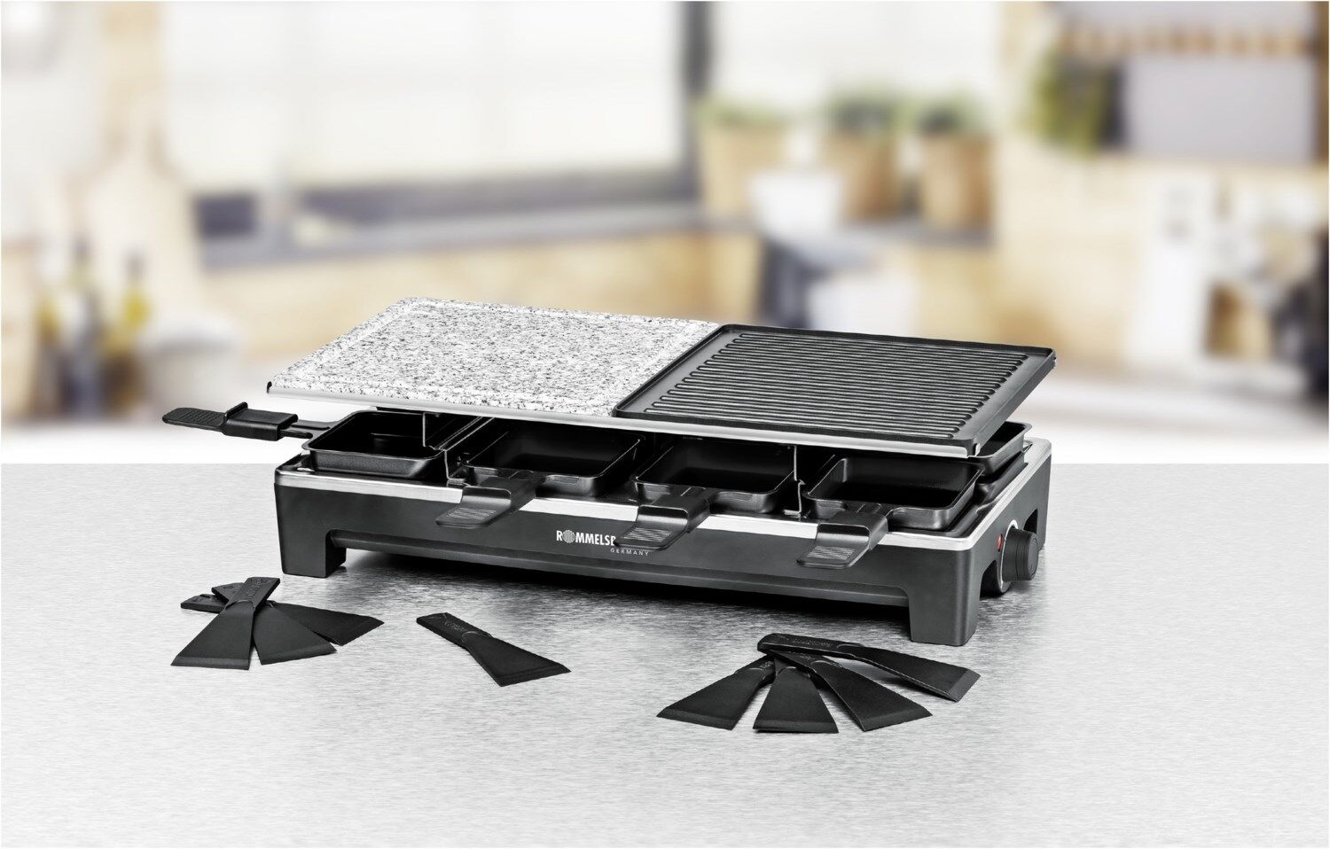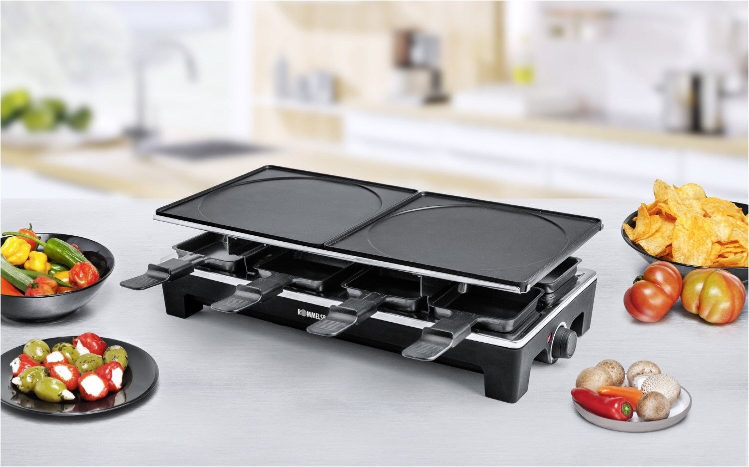 Dieses hochwertige Raclette aus dem Hause ROMMELSBACHER sorgt künftig noch mehr kulinarische Vielfalt beim Raclette-Grillen. Die verschiedenen Wechselplatten lassen sich frei kombinieren, so ist man flexibel in Auswahl und Kombination der Grilloberflächen. Ob auf den beiden hochwertig beschichteten Wendeplatten (eine Seite geriffelt, die andere glatt) oder auf dem Naturstein – für jeden Geschmack ist das Richtige dabei.