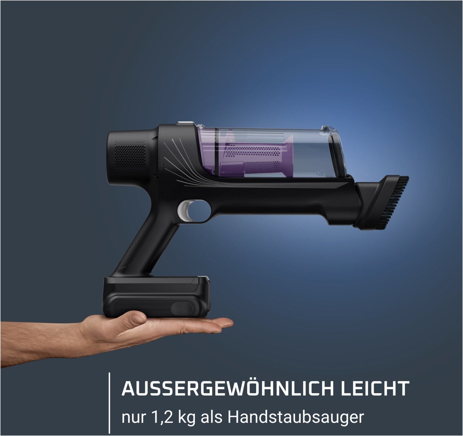 Perfekte Reinigungsergebnisse waren noch nie so einfach wie jetzt, mit einem kabellosen Format und einem komfortablen, ergonomischen und leichten Design – nur 1,2 kg im Handstaubsauger-Modus.