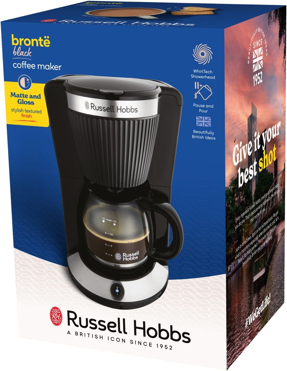 Verleihe deiner Arbeitsfläche einen stylischen Touch und mach deine Kaffeepausen mit der Russell Hobbs Brontë Filterkaffeemaschine in Matt-Schwarz zu etwas Besonderem.