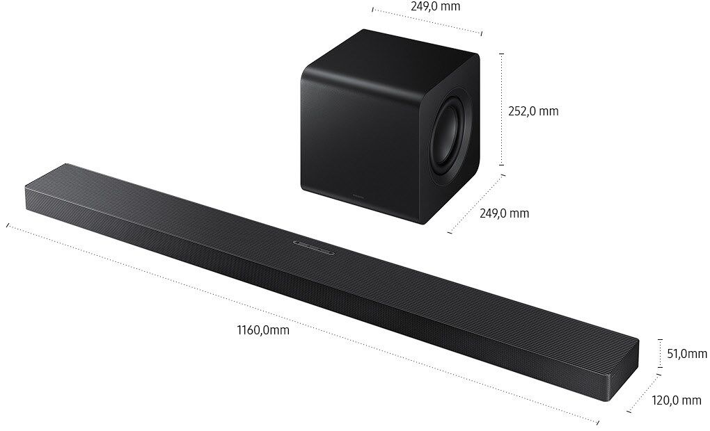 Die Lautsprecher sind so konzipiert, dass sie sowohl als Frontkanäle als auch nach oben abstrahlende Kanäle funktionieren und ihre Klangrichtung automatisch an die Position der Soundbar anpassen. Hol dir satten Bass mit dem kompakteren Subwoofer. Unauffällig im Raum, stark im Sound.