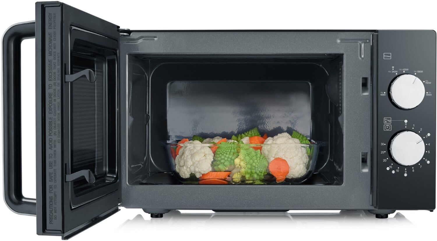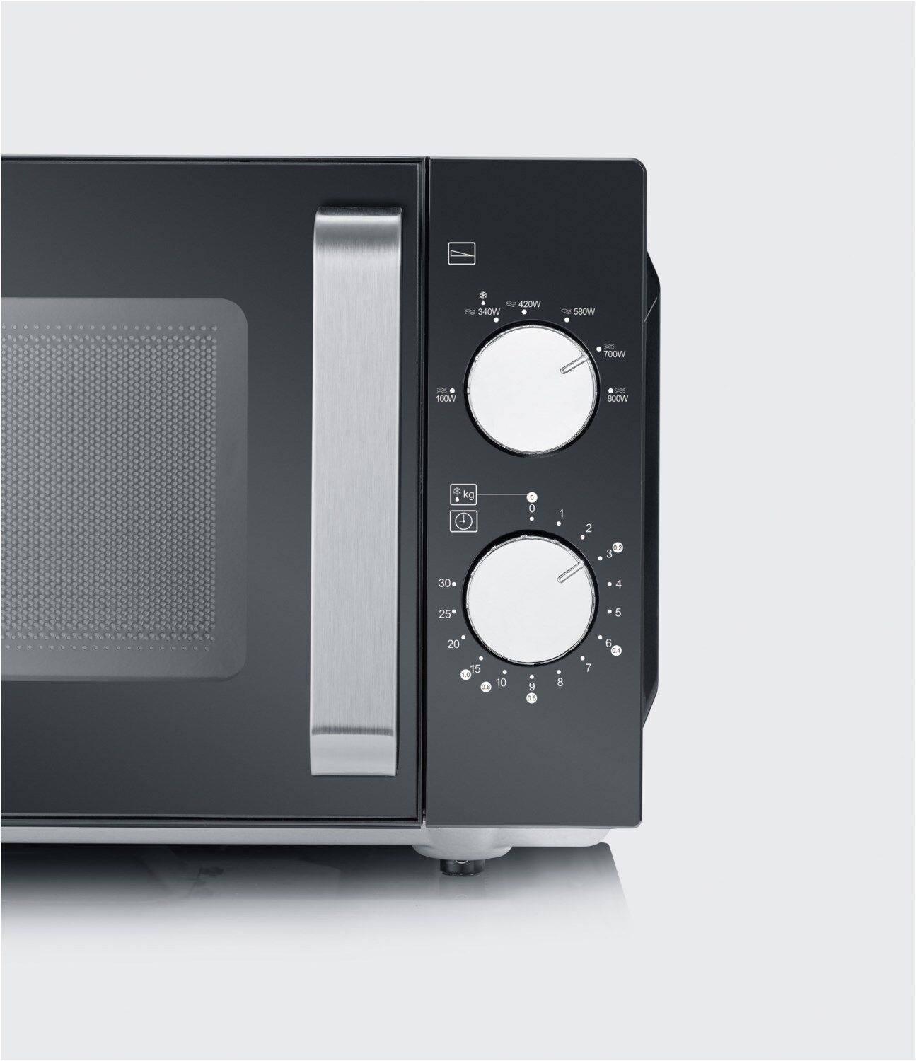 - Einfache und unkomplizierte Bedienung. Zwei Drehregler zur Einstellung der Leistungsstufe und Garzeit.