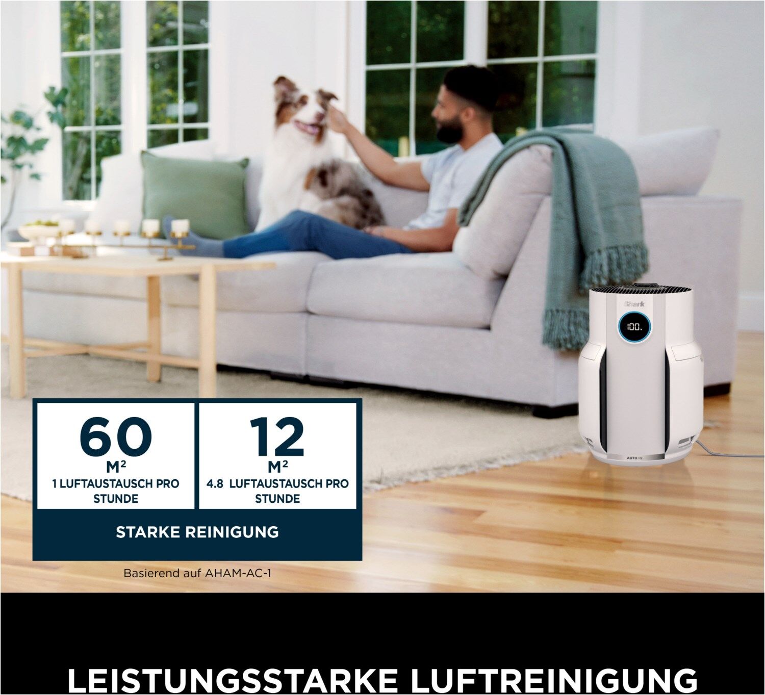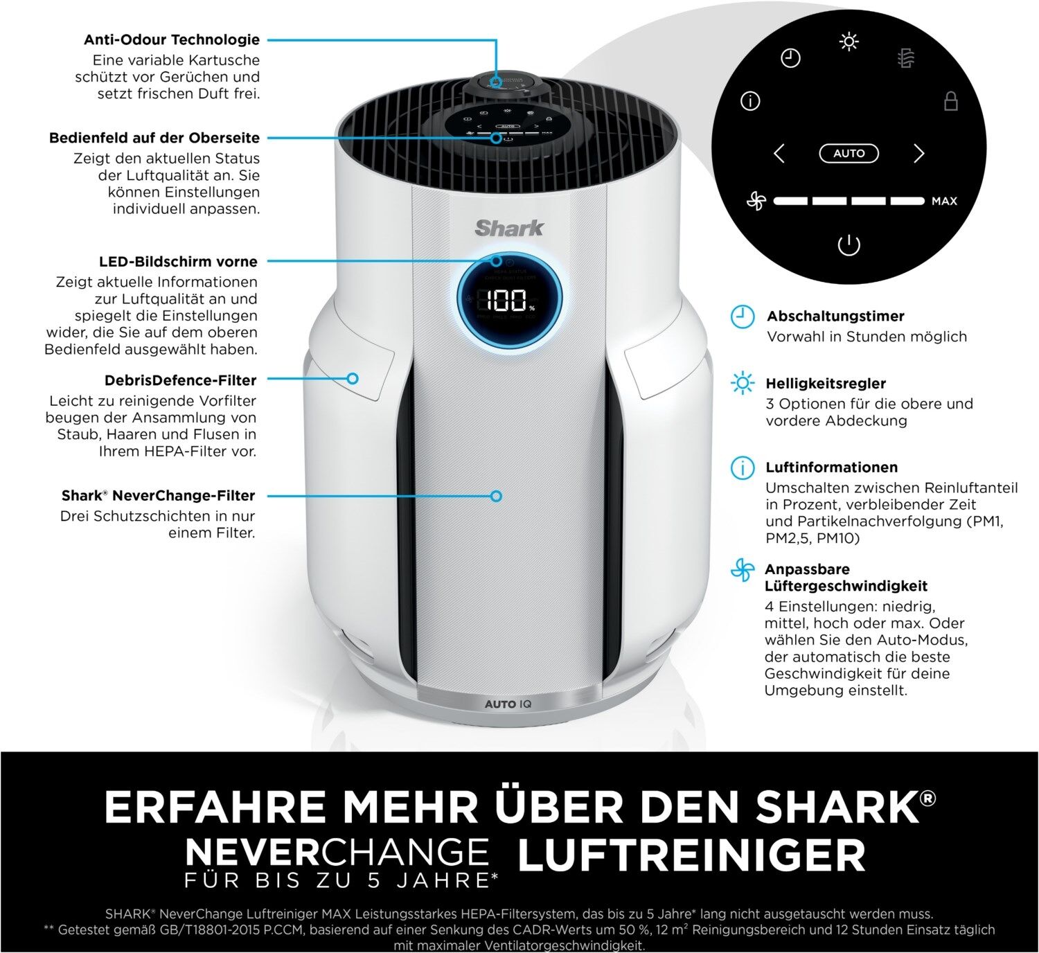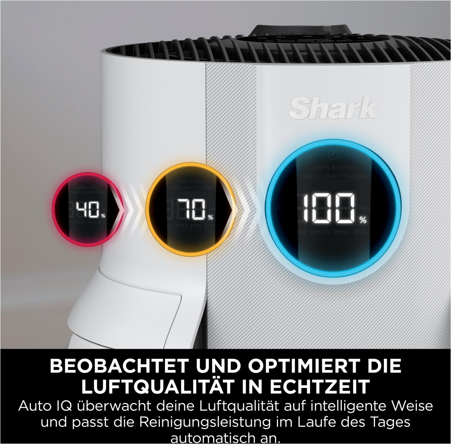 - Luftinformationen - Umschalten zwischen Reinluftanteil in Prozent, verbleibender Zeit und Partikelnachverfolgung (PM1, PM2,5, PM10)