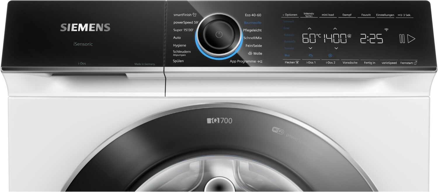 - touchControl-Tasten: Ein/Aus, Fertig in, Fleckenauswahl, i-DOS 2.0 1, i-DOS 2.0 2, Kindersicherung, Memory, Power Spülen, Fernstart, Start / Pause mit Nachlegefunktion, Temperatur, varioSpeed, Vorwäsche, Drehzahlabwahl/ohne Schleudern