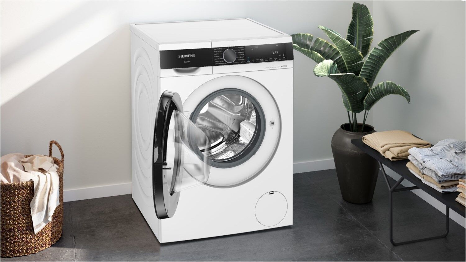 - touchControl-Tasten: Knitterschutz, Fertig in, Fleckenauswahl, Extraspülen, Start / Pause mit Nachlegefunktion, Temperatur, varioSpeed, Vorwäsche, Drehzahlabwahl/ohne Schleudern