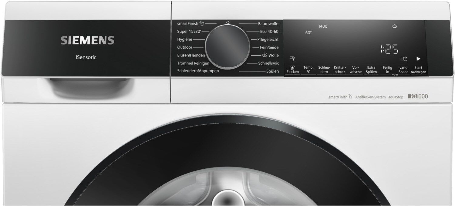 - touchControl-Tasten: Knitterschutz, Fertig in, Fleckenauswahl, Extraspülen, Start / Pause mit Nachlegefunktion, Temperatur, varioSpeed, Vorwäsche, Drehzahlabwahl/ohne Schleudern