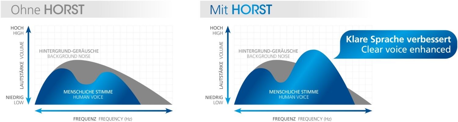 - 2 Einstellmöglichkeiten des Verstärkungsalgorithmus um Sprache/Dialoge von den Umgebungsgeräuschen Effekten zu trennen und die Sprache für bessere Verständlichkeit hervorzuheben