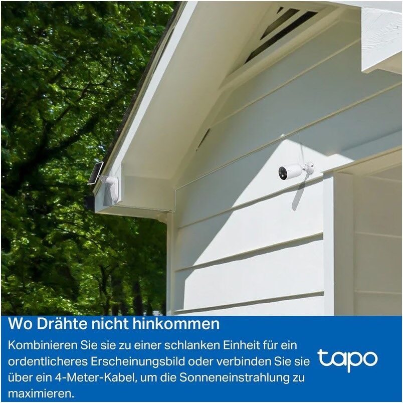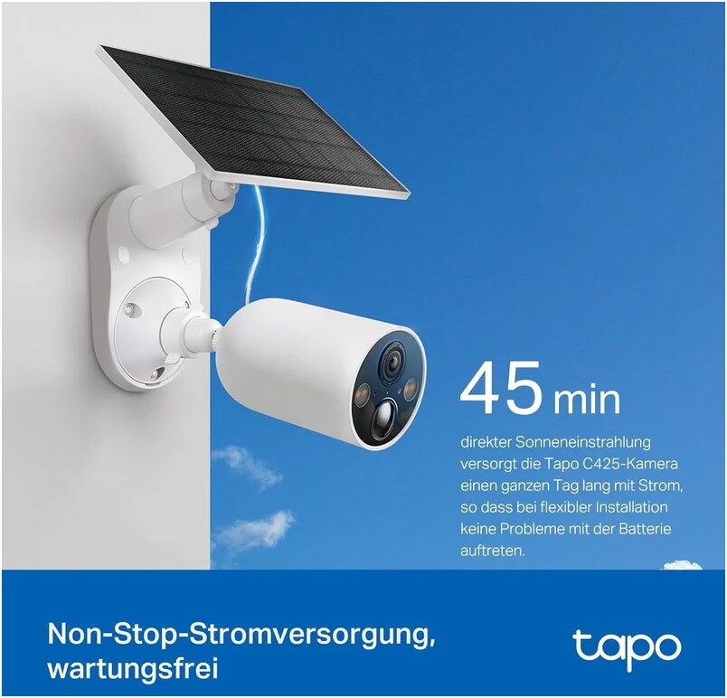 45min direkter Sonneneinstrahlung versorgt die Tapo C425-Kamera einen ganzen Tag lang mit Strom, so dass bei flexibler Installation keine Probleme mit der Batterie auftreten.