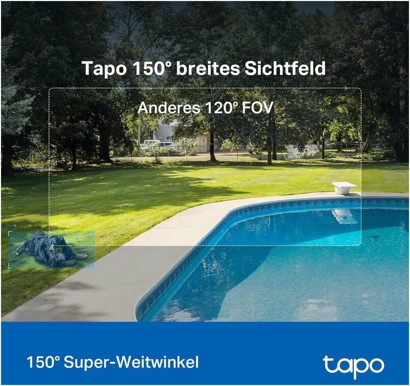 Die Tapo C425 erweitert Ihren Sichtbereich mit einem 150° Super-Weitwinkel, so dass Sie mehr wichtige Bereiche im Auge behalten können.