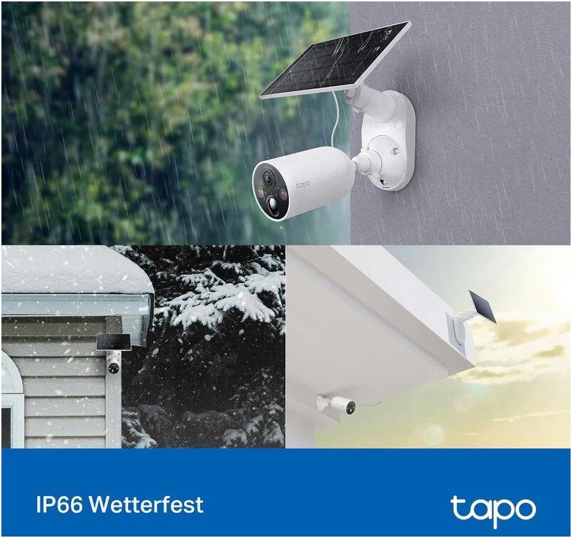Das Tapo C425 KIT ist staub- und strahlwassergeschützt, mit einer IP66-Einstufung für das Tapo C425 und einer IP65-Einstufung für das Solarpanel. Es funktioniert gut bei Regen, Schnee, Staub und Hitze und arbeitet zuverlässig bei Temperaturen von -20 bis 45°C.