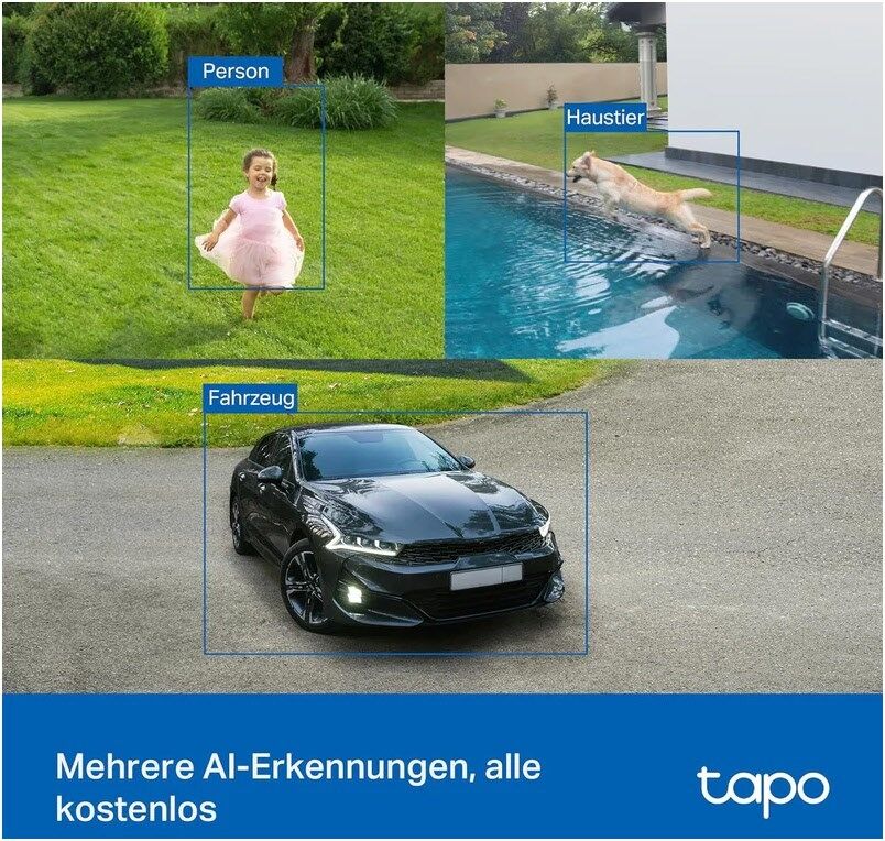 - Kostenlose AI-Erkennung - Mithilfe von KI-Technologie gibt die Kamera Warnungen aus, wenn sie Personen, Haustiere und Fahrzeuge erkennt, um Fehlalarme und unnötige Benachrichtigungen zu vermeiden
