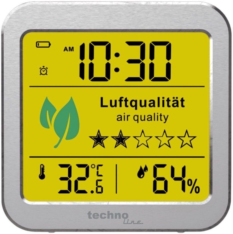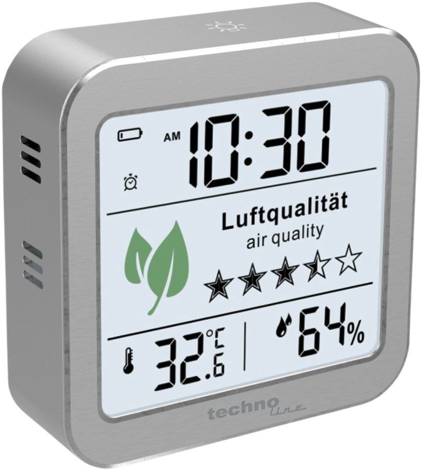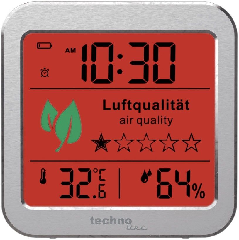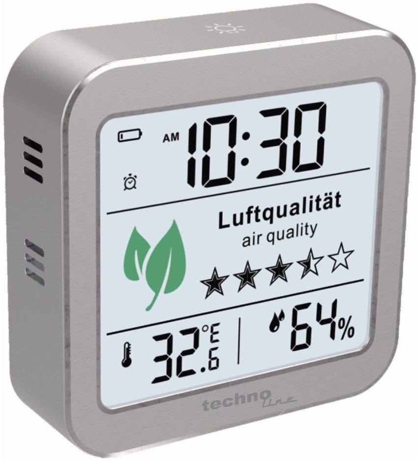 - Die Lüftgüte wird nur bei der Nutzung mit USB-Adapter (inkl.) angezeigt, um die Batterien zu schonen! Uhrzeit, Temperatur und Luftfeuchtigkeit bleiben auch im Batteriebetrieb sichtbar