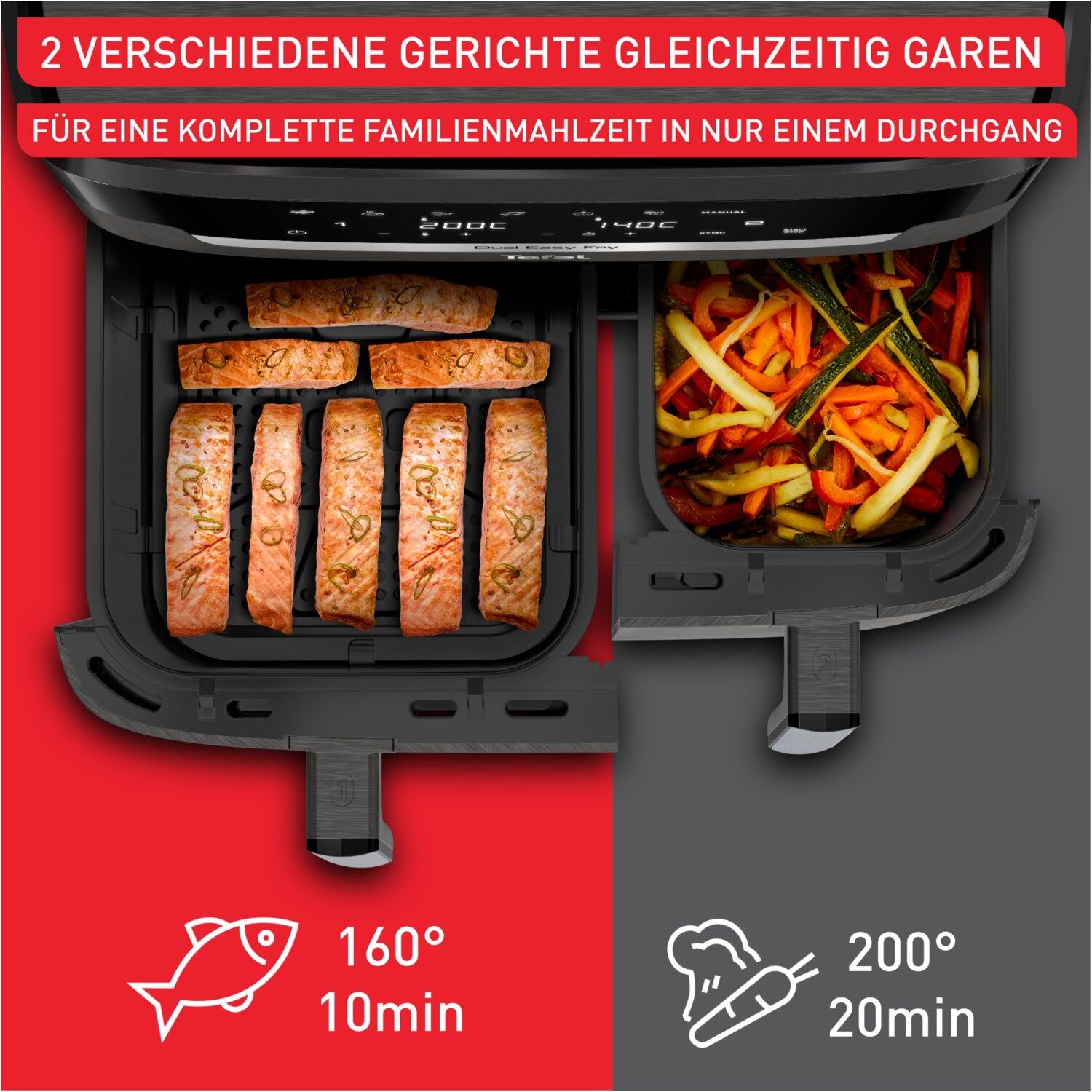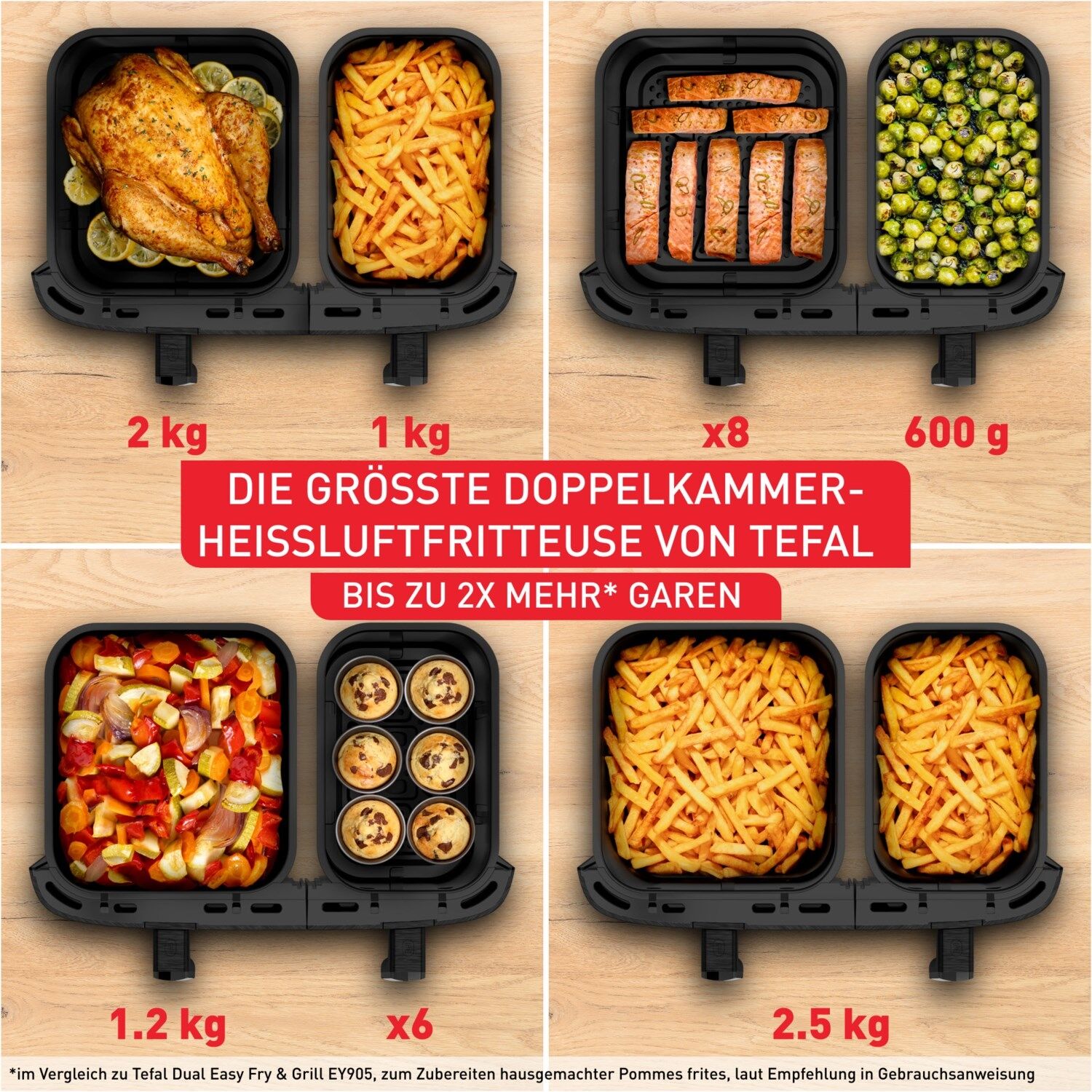 Entdecken Sie die 11-Liter-Doppelkammer Heißluftfritteuse von Tefal, mit der Sie in einem Durchgang und in weniger als 15 Minuten komplette, hausgemachte Mahlzeiten für die ganze Familie zubereiten können! Dual Easy Fry XXL von Tefal verfügt über zwei voneinander unabhängige Schubladen, in denen zwei verschiedene Gerichte gleichzeitig auf den Punkt zubereitet werden können – von köstlich knusprigen Pommes Frites bis hin zu leckerem Fleisch, Fisch, Gemüse und sogar Desserts.