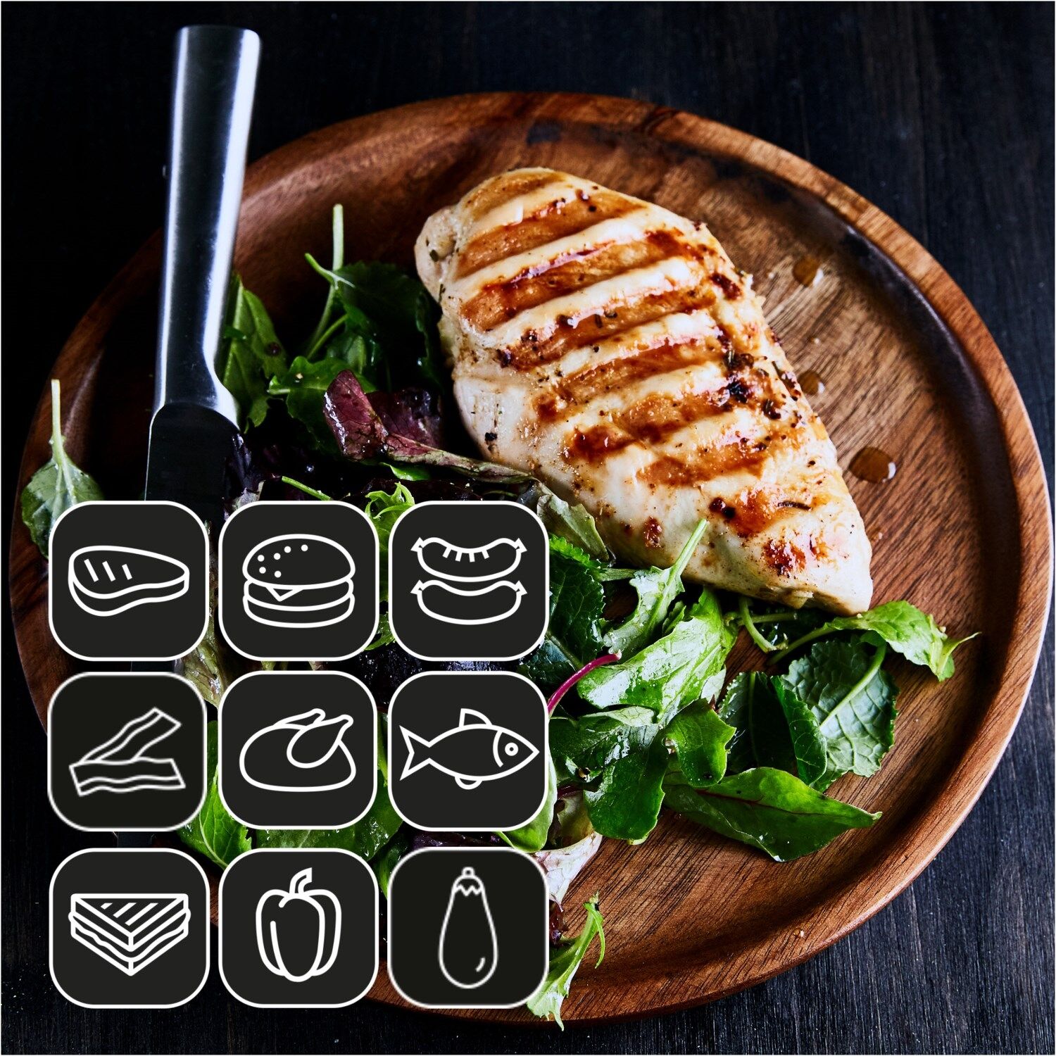 - 9 voreingestellte Grillprogramme: Burger, Steaks, Sandwiches, Würstchen, Fisch, Geflügel, Bacon, Paprika, Aubergine statt Meeresfrüchte und schweinefleisch