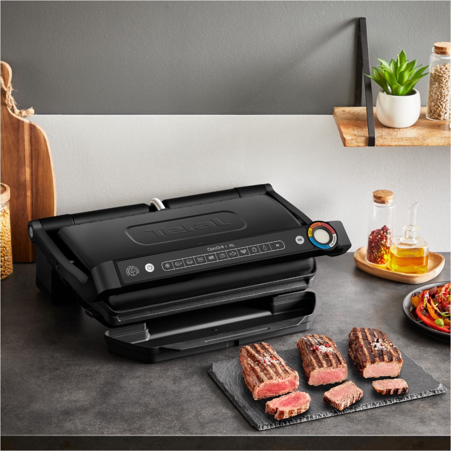 Perfekte Grillergebnisse ganz nach Ihrem Geschmack dank 9 voreingestellter automatischer Programme! Mit der exklusiven Technologie wird je nach Dicke und Art des Grillguts die Grilltemperatur und Grillzyklen automatisch angepasst. Eine 33 % größere Grillfläche gegenüber dem klassischen Optigrill bietet Platz für Mahlzeiten für 6 bis 8 Personen. Per Lichtindikator wird der Garzustand des Fleisches angezeigt und die Neigung der Platten sorgt für ein gesundes Grillen. Im manuellen Modus können vier Temperaturlevels eingestellt werden, um auch so optimal Obst und Gemüse grillen zu können.