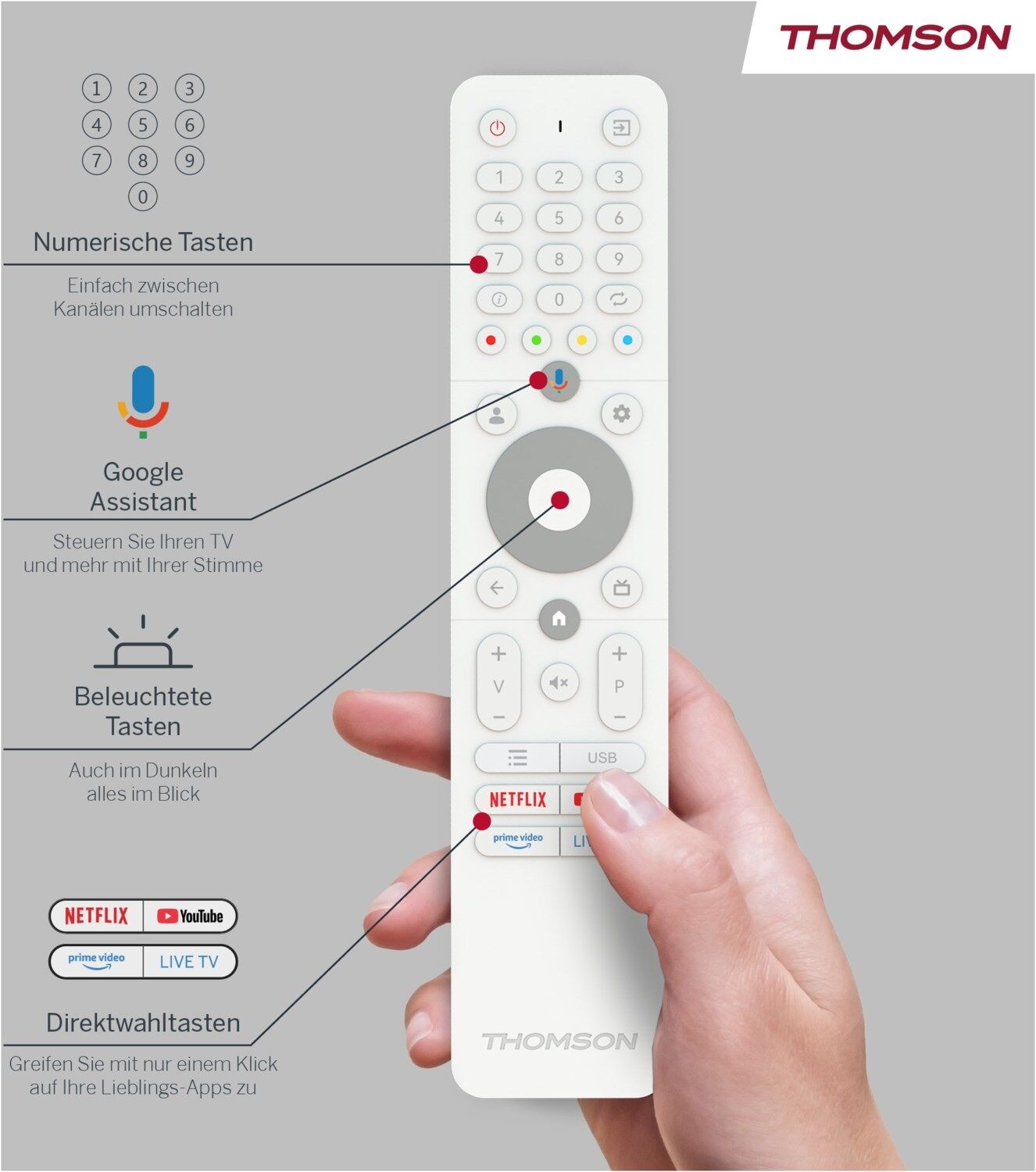 Mit dem 32-Zoll-HD-Fernseher THOMSON Go TV genießen Sie Entertainment überall – mühelos und flexibel. Das Betriebssystem Google 5.0 vereint Inhalte Ihrer Streaming-Apps und Abonnements in einer intuitiven Benutzeroberfläche.