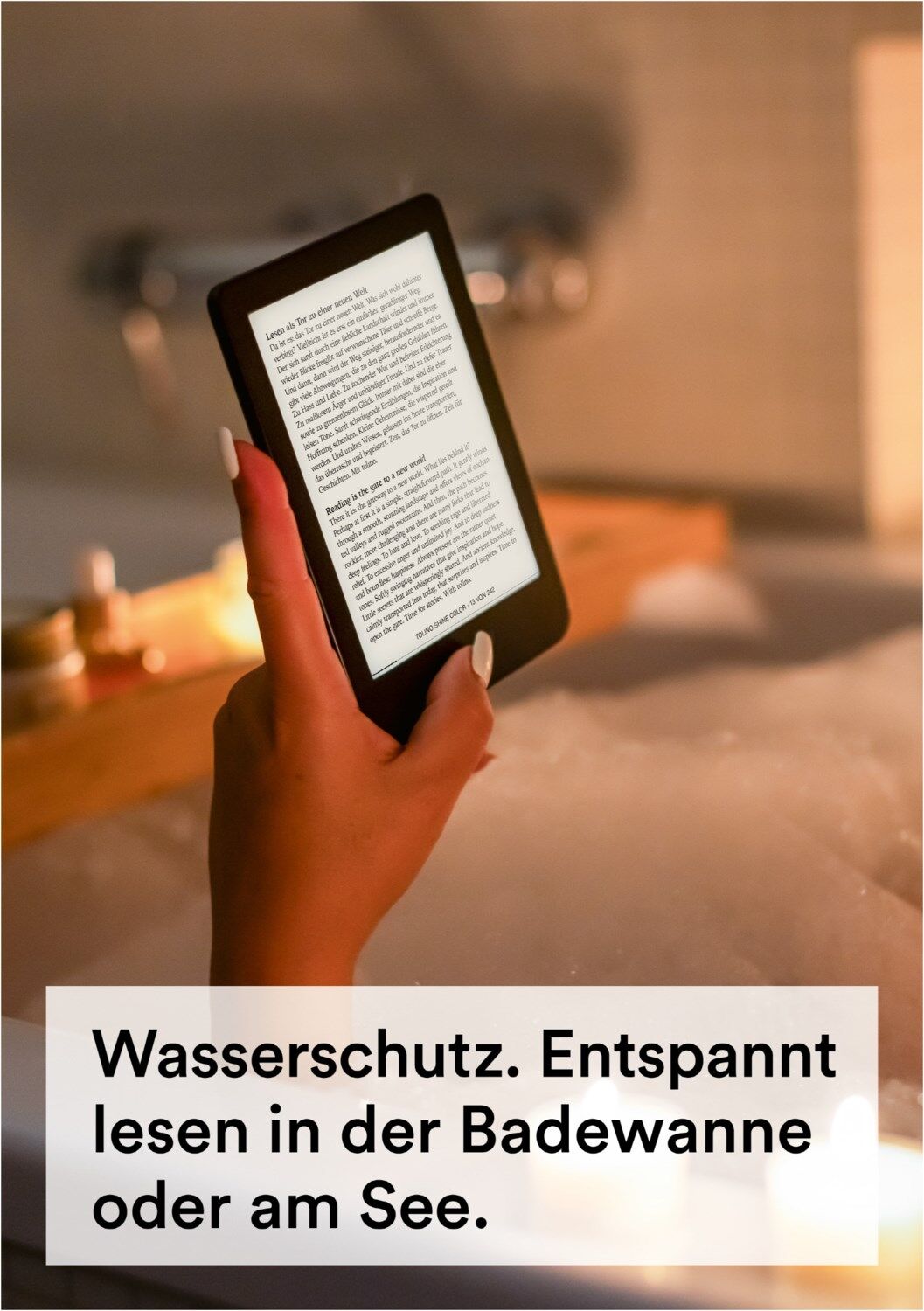 Für alle Eventualitäten gewappnet, erleben Sie mit dem wassergeschützten¹ tolino shine color eBook-Reader auch in der Badewanne oder am Pool eine entspannte Leseauszeit mit Ihrem Lieblings-eBook.