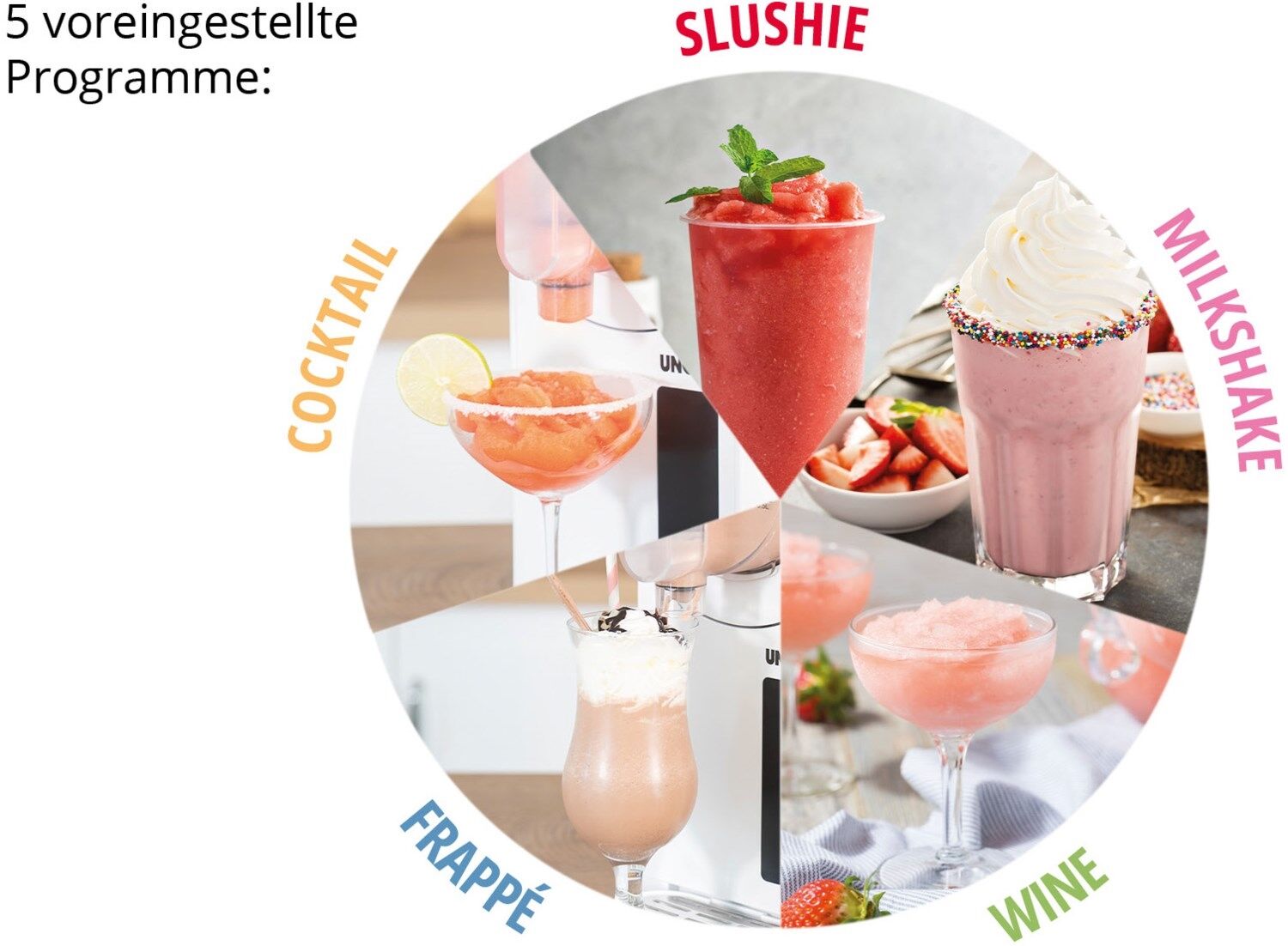 - Perfekte Ergebnisse dank des digitalen Touchdisplays und 5 voreingestellten Programmen: SLUSHIE, FRAPPE, MILKSHAKE, COCKTAIL und WINE