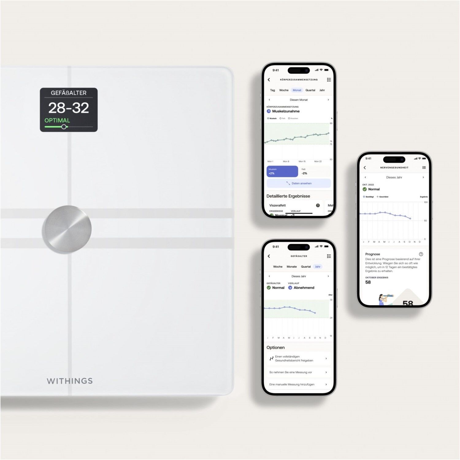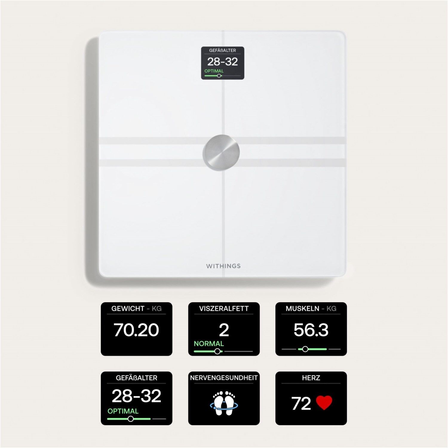 - Smarte Gesundheitswaage zur Messung von diversen Vitalparametern: Gewicht, BMI, Körperzusammensetzung, Gefäßalter, Pulswellengeschwindigkeit, Herzfrequenz im Stehen, Nervengesundheit, Grundumsatz und Stoffwechselalter
