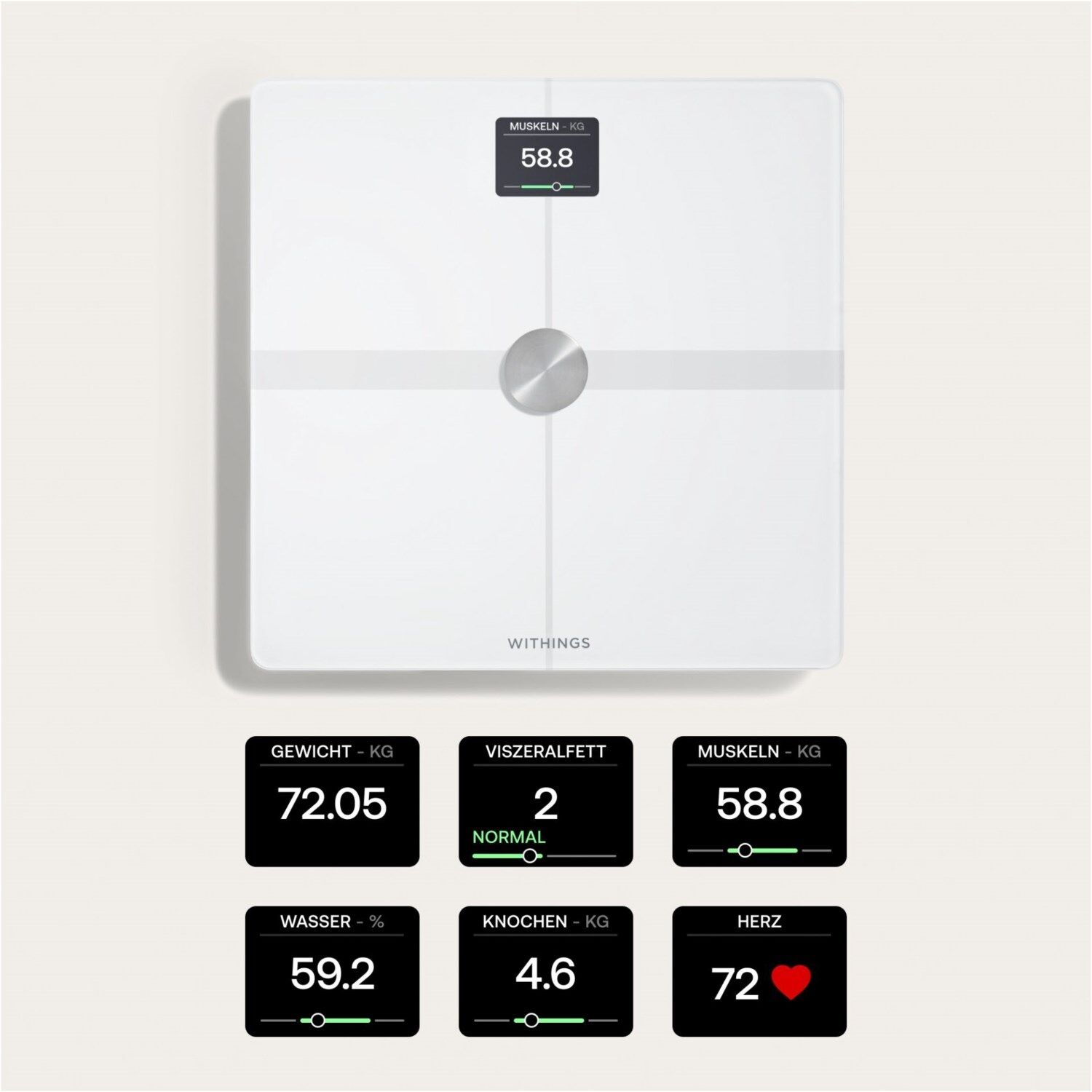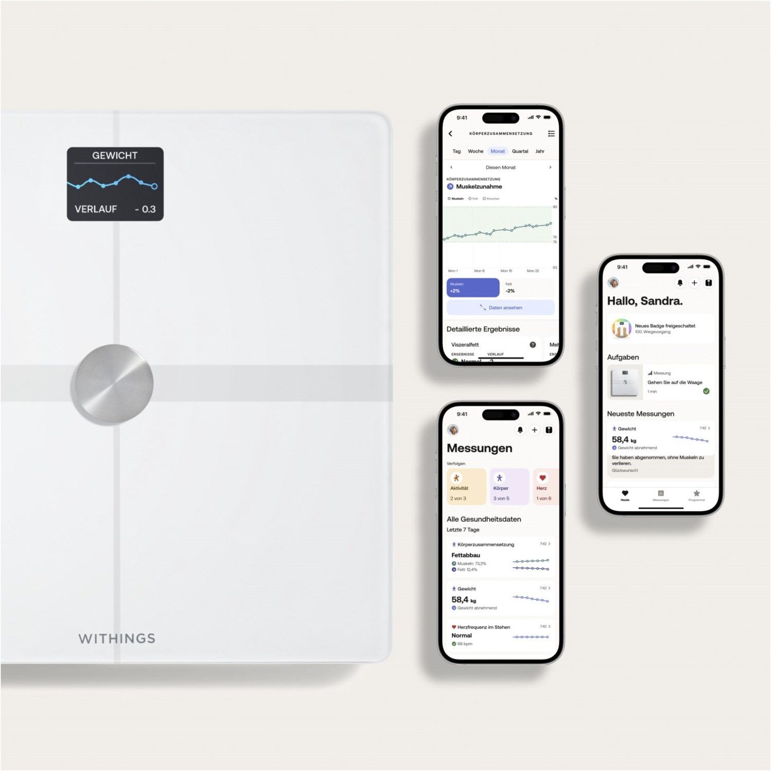 Die Daten werden nach jedem Wiegen automatisch mit der Withings-App (iOS und Android) synchronisiert, ohne dass das Smartphone in der Nähe der Waage sein muss. Bis zu acht Nutzerinnen und Nutzer können ihre jeweiligen Daten dokumentieren. Die Körperwaage besteht aus hochgradig gehärtetem Glas mit 4 Elektroden und verfügt über einen kontrastreichen 2,8-Zoll-Farbbildschirm. Die enthaltenen AAA-Batterien versorgt die Waage für bis zu 15 Monate mit Strom.