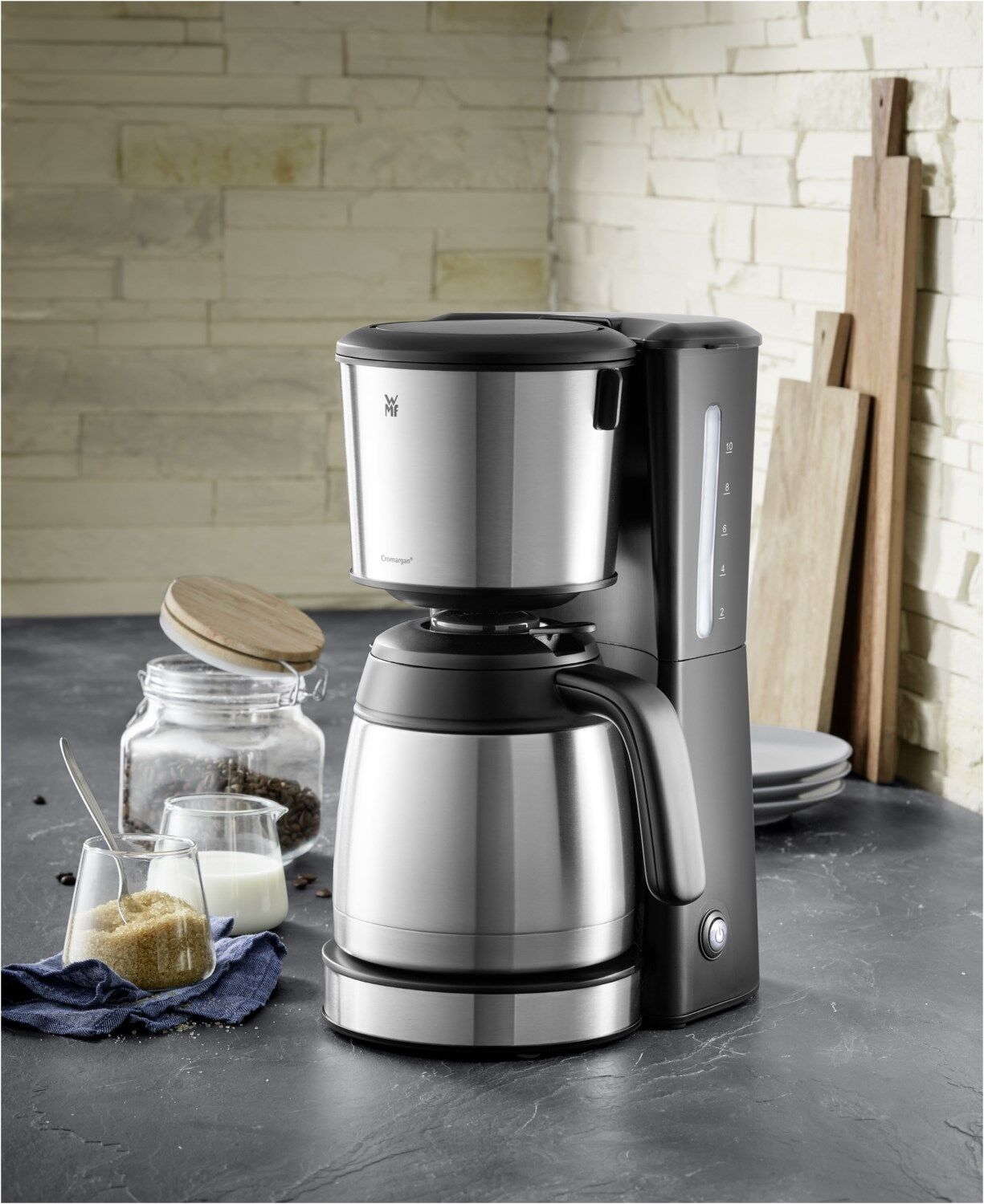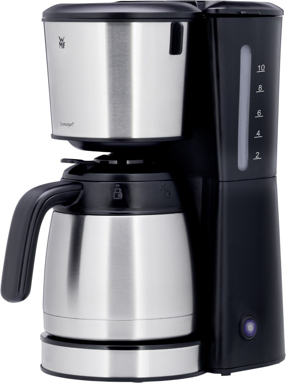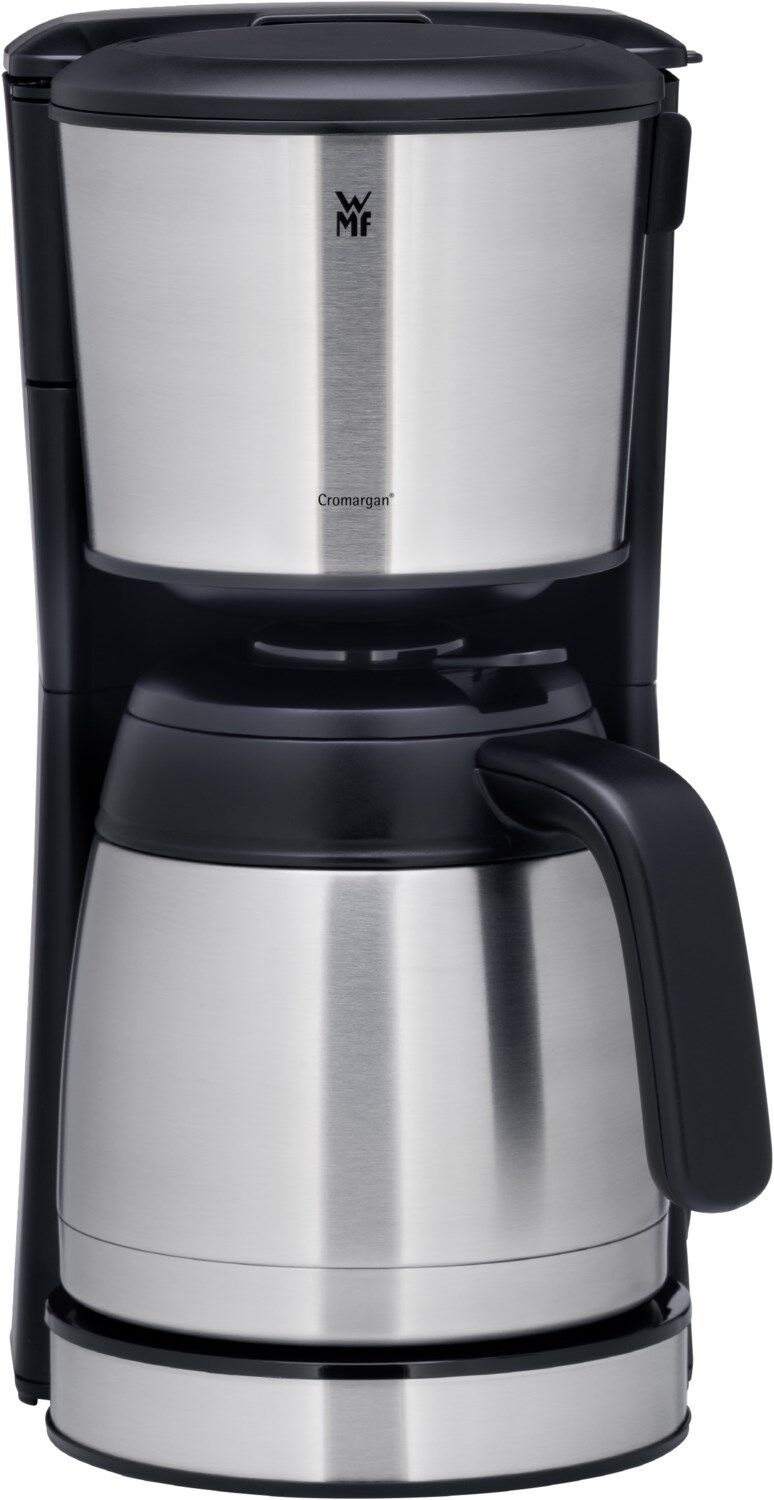 Mit ihrem schlichten und eleganten Design sowie dem Gehäuse aus hochwertigem mattgebürsteten Cromargan® fügt sich die WMF Bueno Pro Kaffeemaschine mühelos in jedes Küchenambiente ein. Mühelos und komfortabel ist auch die Bedienung: Mit Hilfe der außenliegenden Wasserstandsanzeige erfolgt die Portionierung auf die Tasse genau. Bis zu 10 Tassen à 125 ml duftenden Kaffees passen dabei in die Thermoskanne, die bei Bedarf stundenlang die optimale Trinktemperatur hält. Und auch das Kaffeepulver selbst wird dank des Schwenkfilters bequem und krümelfrei eingefüllt. Danach genügt ein einfacher Druck auf die Start-/Stopptaste (mit Kontrollleuchte) und dem baldigen Kaffeegenuss steht nichts mehr im Wege. Der Filtereinsatz (1 x 4) ist zum Reinigen entnehmbar und so konstruiert, dass ein Nachtropfen oder gar Überlaufen ausgeschlossen ist.