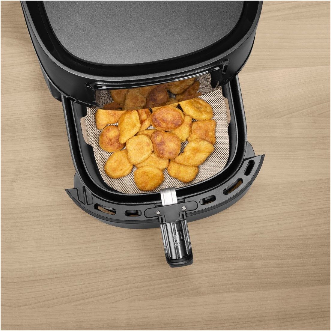 Fettauffang-Einsatz: Die Schutzeinlagen halten die Fritteuse sauber. Die geschlossene Einlage wird in den unteren/äußeren Korb gelegt und schützt vor austretenden Flüssigkeiten, 24 x 25 cm. Die perforierte Einlage wird auf den inneren Korb/auf die Platte gelegt und verhindert das Anhaften des Garguts auf dem Gitterost, 23,2 x 24,2 cm. Dampfdurchlässiges Material für ungehinderte Luftzirkulation in der Fritteuse. Hitzebeständig bis 260 °C. Zuschneidbar auf die gewünschte Größe - für alle handelsüblichen Airfryer geeignet. Seitliche Laschen, um die Einlagen nach Gebrauch bequem zu entnehmen. Einfach zu reinigen: spülmaschinengeeignet. Die Filter sind wiederverwendbar, bei richtiger Anwendung bis zu 100 Mal. BPA-frei.